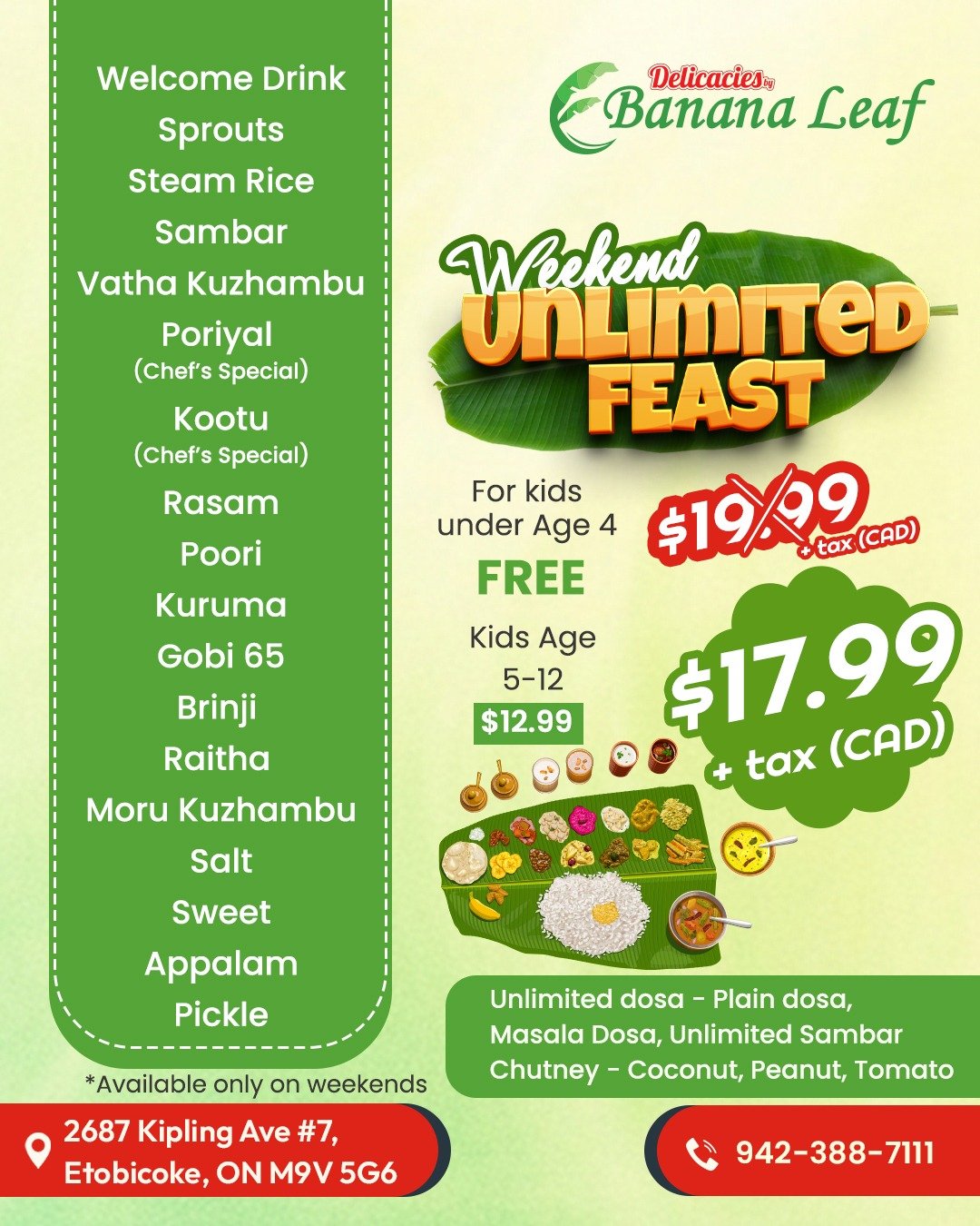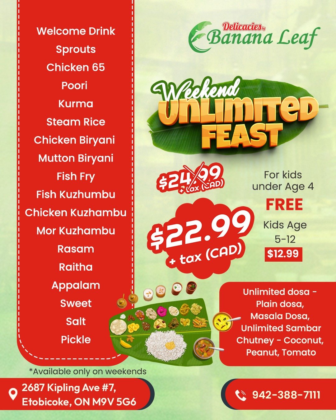 Join us at Banana Leaf Restaurant in Canada for a dining experience that blends the warmth of South Indian tradition with Canadian hospitality. Book your table or catering order today and let us bring the flavors of South India to your plate!